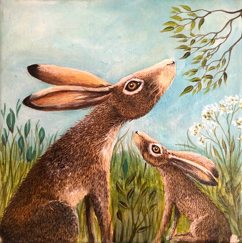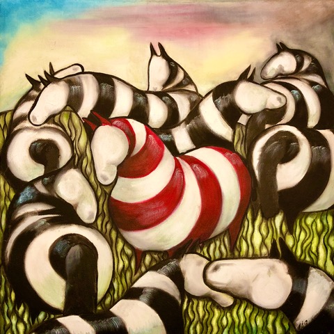 Becca Galbraith has a playful illustrative style and draws her inspiration from her lifelong love of animals and nature. She uses her strong sense of colour, movement and form to paint in a variety of mediums often using recycled canvases and frames. “I am always hoping to capture some connection between the beauty of the natural world and my imagination”.